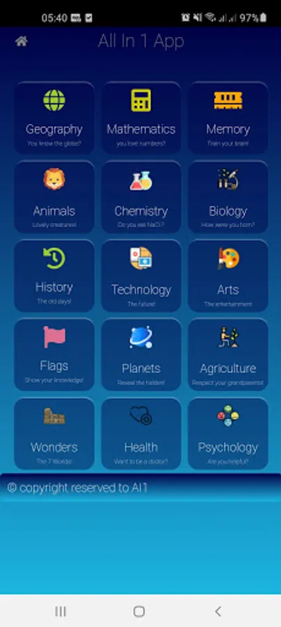AI1 - IS ALL IN ONE APPLICATION, WHERE YOU CAN READ ABOUT DIFFERENT TOPICS LIKE: Geography, Mathematics, Memory, Animals, Chemistry, Biology, History, Technology, Arts, Flags, Planets, Agriculture, Wonders, Health, Psychology.