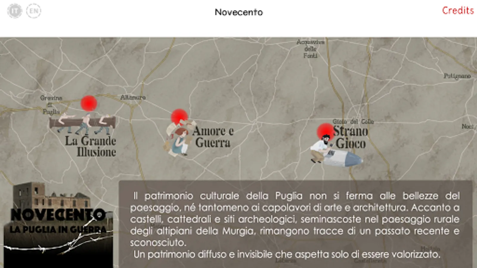 Find out more with "Novecento. La Puglia in Guerra" a project realized by Ai2 s.r.l., composed by three interactive tales dedicated to the sites of the Murgia that preserve material remains and memories of the two World Wars and of the Cold War the prison camp of World War I and the monument of the Black Cross (Altamura); the prison camp of World War II (Altamura); the NATO camp for Jupiter missiles (Bosco Difesa Grande, Gravina).