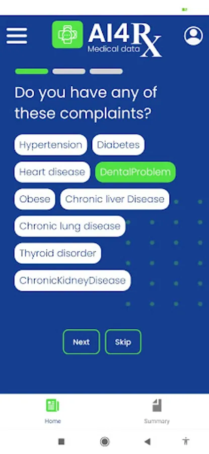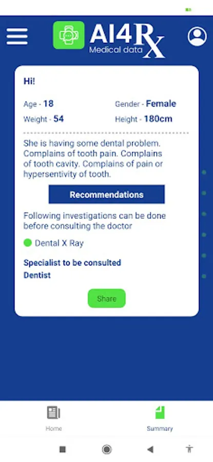 This App helps you to inform the doctor about your medical problems in your language. Our AI generates relevant questions that mimic the way an expert doctor would ask to diagnose before prescribing. A medical summary is generated and guides you to the concerned medical speciality. Further investigations are recommended for quick diagnosis. A patient can communicate the summary to the doctor or specialist for an accurate diagnosis. It also provides you with a second opinion.