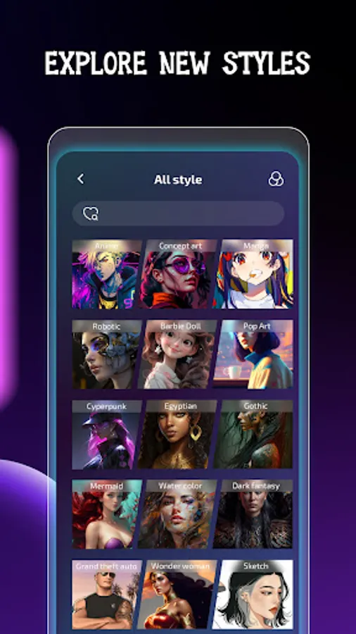 Our application provides users with a variety of styles such as: cartoon, anime, baby doll, Pop Art, Women, ...