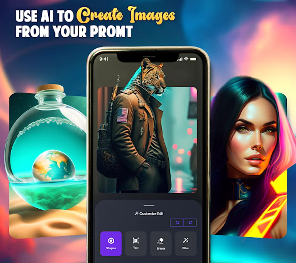 Simple and easy to use, the AI image generator or Ai photo generator is backed by artificial intelligence to transform your written prompts into art. This revolutionary app combines creative artificial intelligence with the art of painting drawing and AI-generated art
