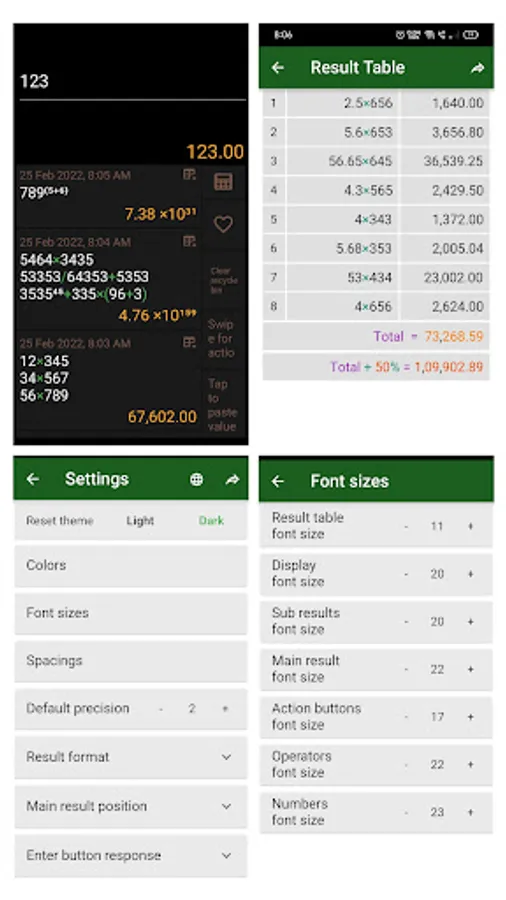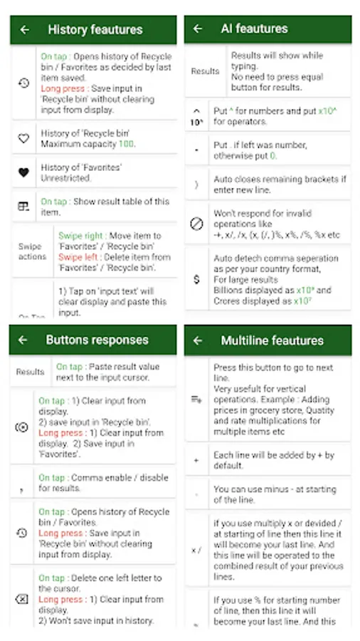 - History => [swipe left : delete item, swipe right : move to favorites & clickOnInput : clear and paste input & clickOnResult : paste result value].
