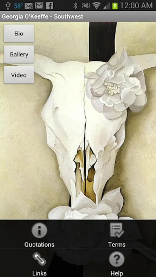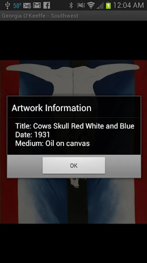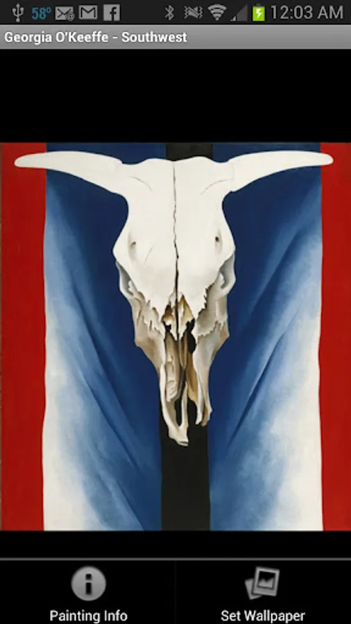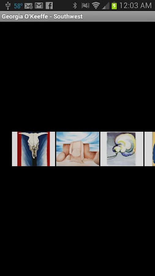 Georgia O’Keeffe – Southwest is a free Android Application show casing one of America’s most important modern artists. “Georgia O’Keeffe – Southwest” is a project designed to extend public knowledge of Georgia O’Keeffe’s art. It is not a commercial venture; therefore, it shall remain free on the Android Market and will not contain advertising such as admob, etc. Images contained in the app are not cropped or altered in anyway. All photo’s contain painting information attributing proper credit to the original artist, title, and year it was painted.