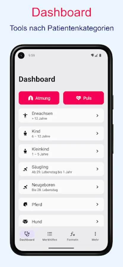 Standard values and tools for recording vital parameters are provided for each patient age. With simple taps on the screen or on the smartwatch, the breathing or pulse rate can be recorded quickly and easily. The Glasgow Coma Scale can be collected for patients just as quickly and efficiently. The APGAR score can be quickly and easily determined for newborns so that it can be reliably documented. Combustion formulas such as the rule of nine or the Baxter-Parkland formula are also integrated so that they can be calculated quickly and correctly even in a stressful situation.