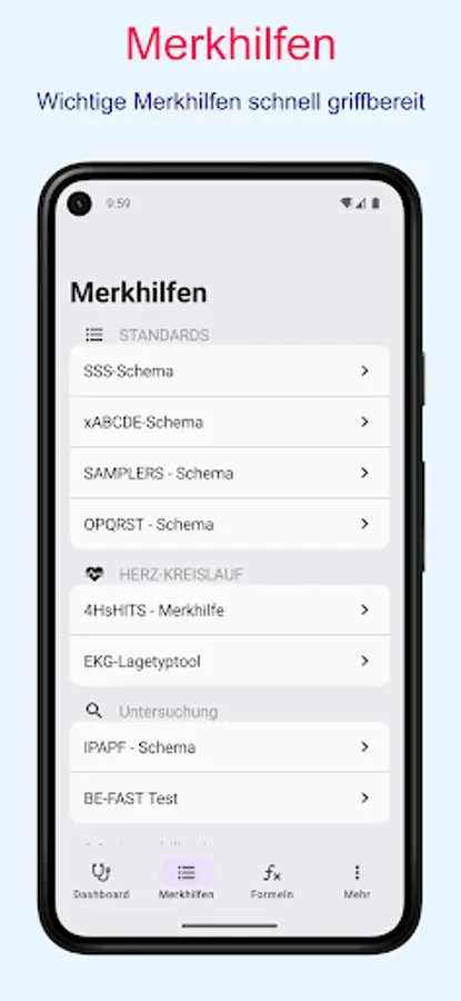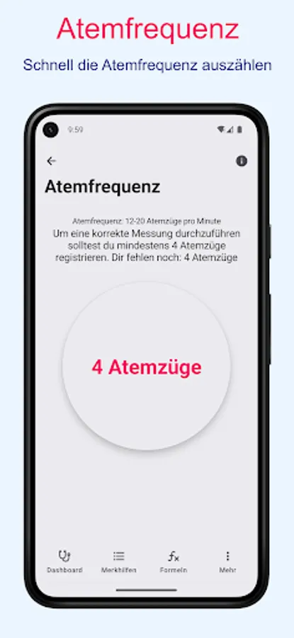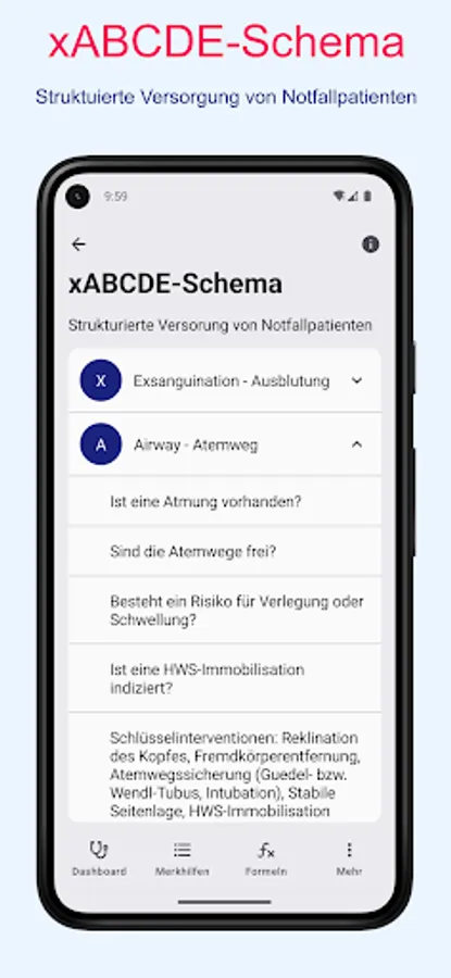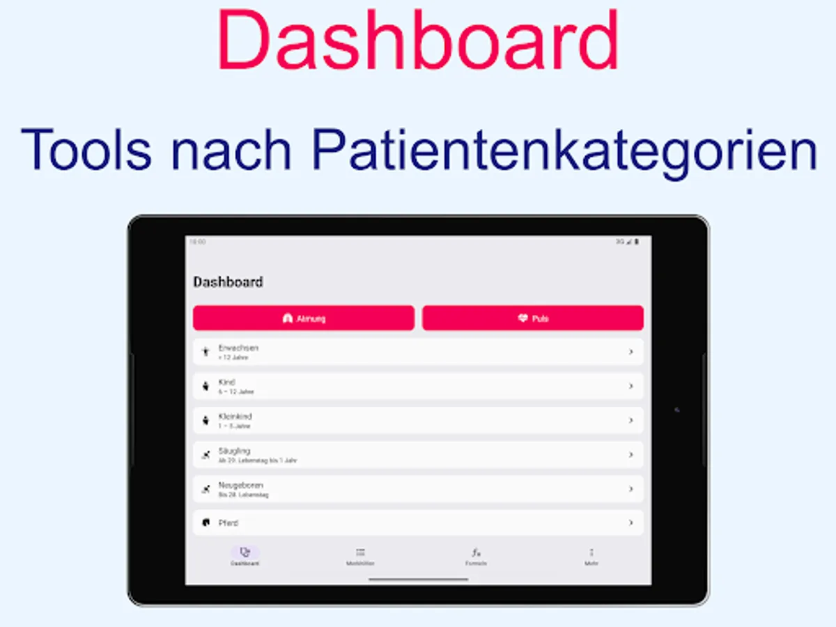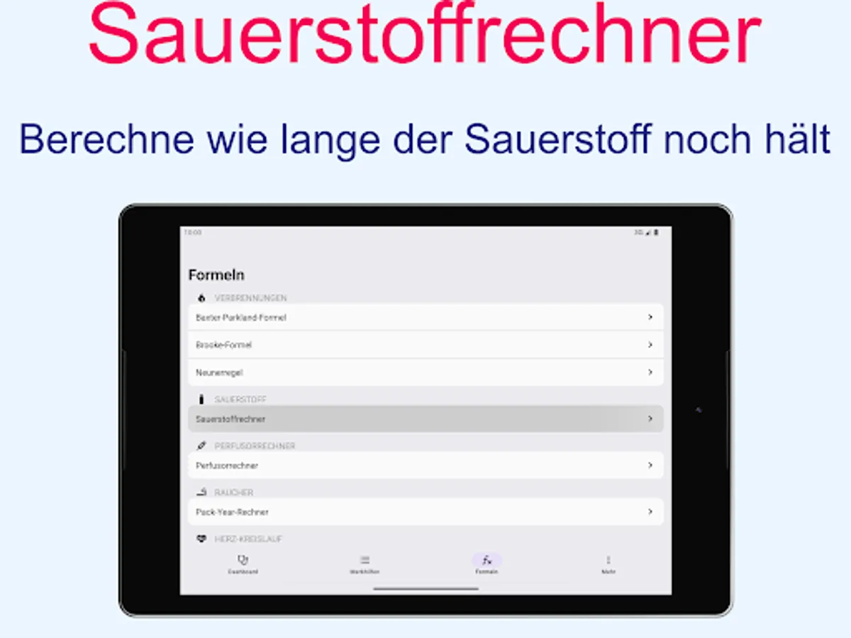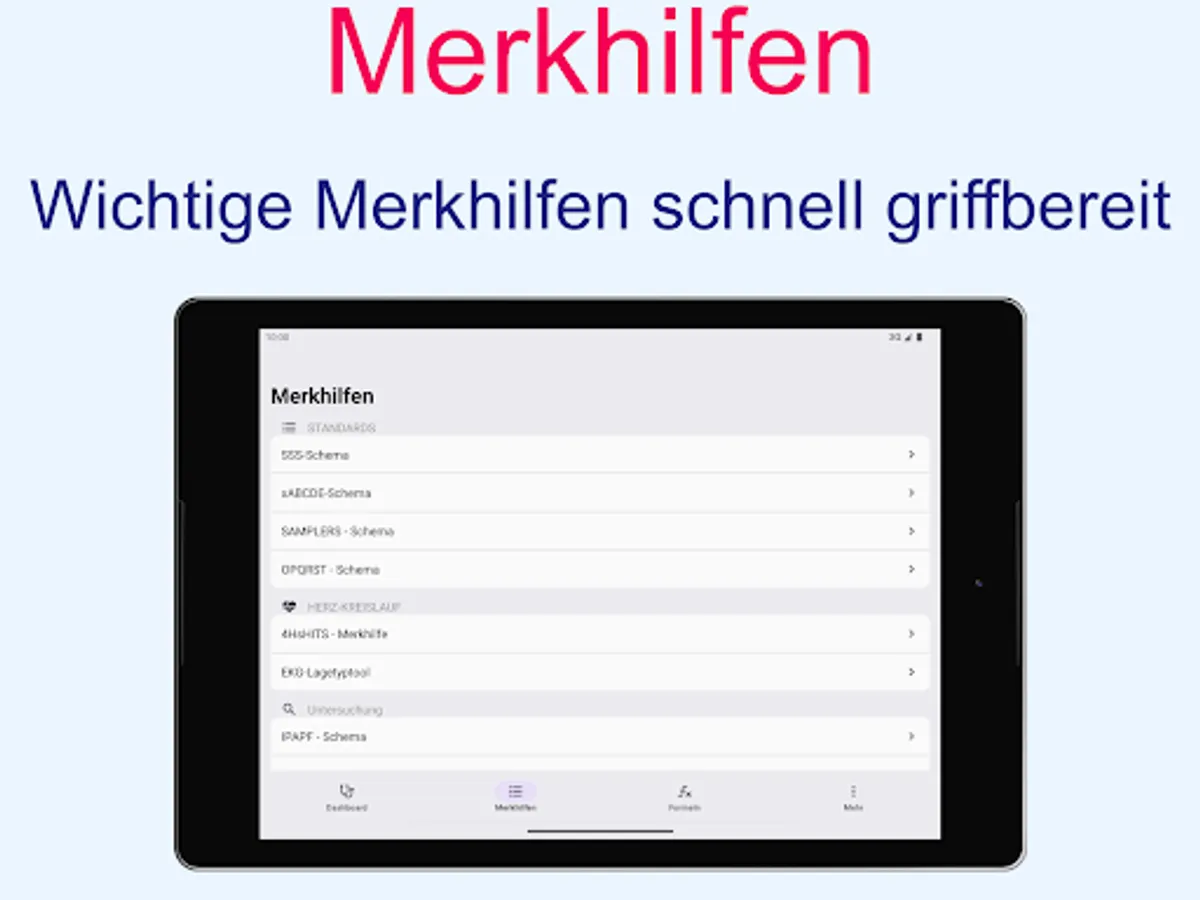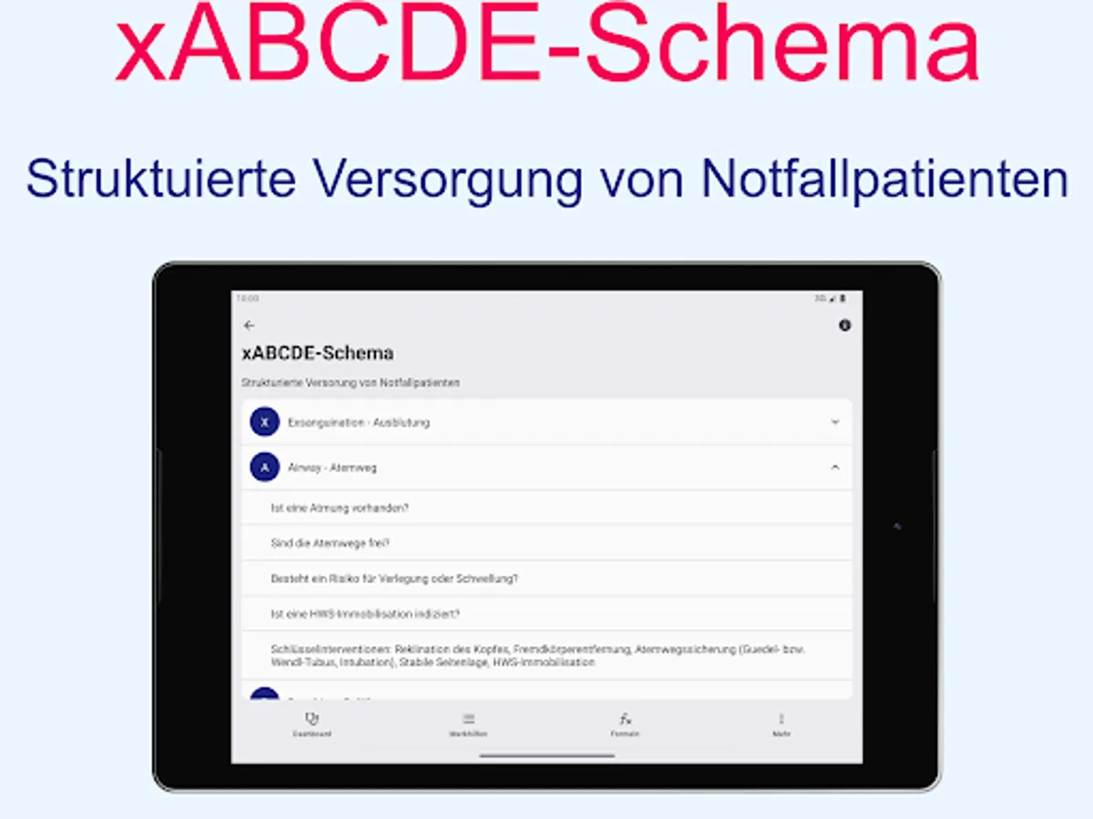 With this app it is possible for the first time to count heart rate and breathing rate. The app automatically calculates the frequency based on the beats and extrapolates them per minute. In addition, the qSofa score, the APGAR score and the GCS can be collected. The memory aids contain the ABCDE, SAMPLERS and OPQRST, IPAPF, ATMIST, ISBAR, WOLKE, MELDEN, BASICS, PECH, and the 4Hs&HITS, as well as BE-FAST and others. Oxygen Calculator, PY Calculator, Perfusor Dose Calculator, Rule of Nine, Mean Arterial Blood Pressure Calculator, as well as the Baxter-Parkland and Brooke Formulas are included in the formulary to help keep a cool head. An interactive ECG position type tool makes it easier to determine the position type in the ECG.