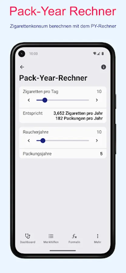 In addition to the combustion formulas, the formula collection also contains the pack year calculator and an oxygen calculator.
