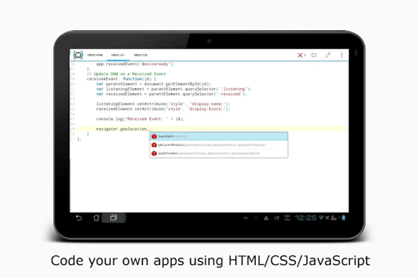 AIDE for PhoneGap is an integrated development environment (IDE) for developing portable PhoneGap Apps directly on Android devices. You can use your exisiting HTML5/CSS/JavaScript web development skills to build Apps which can be quite easily transfered to various mobile platforms.