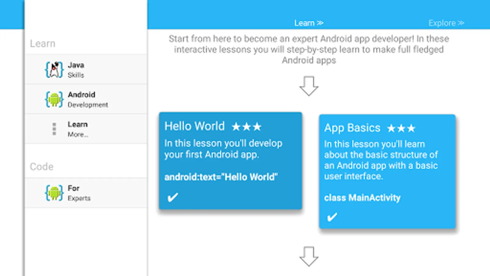 AIDE features interactive lessons with step-by-step instructions to learn Android app development and Java programming skills. Follow the lessons, become an expert and apply what you've learned in your own app projects.