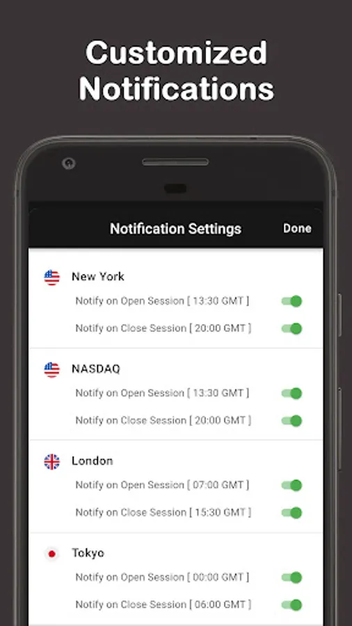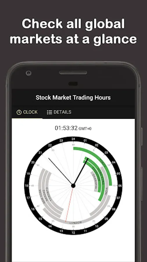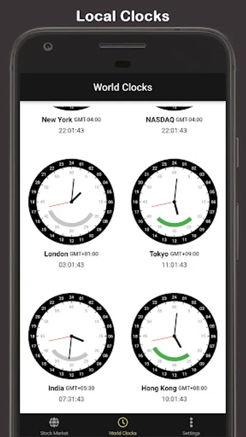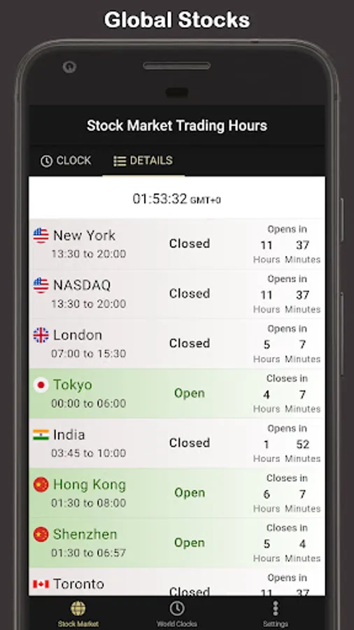 Stock market hours clock tracks global stocks trading hours opening and closing hours with notification option to notify you when different stock markets opens and closes.