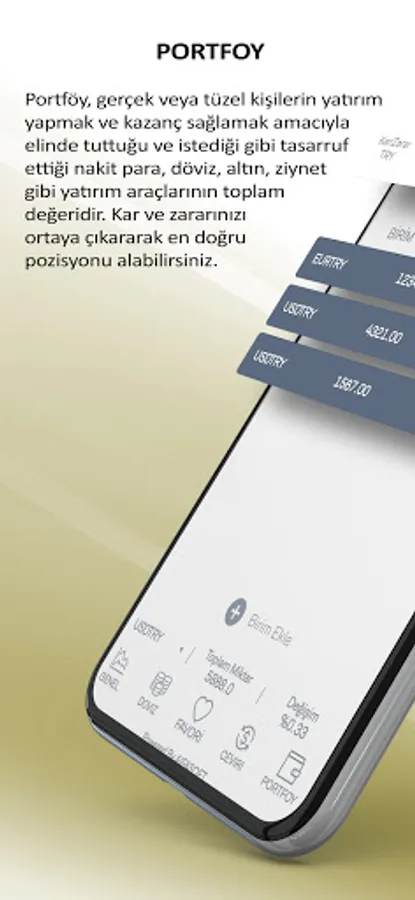 Portfolio is the total value of investment instruments such as cash, foreign currency, gold, jewelery that real or legal persons hold in order to invest and earn profits and save as they wish. You can take the most accurate position by revealing your profit and loss.