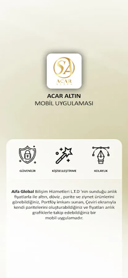 It is a mobile application where you can see gold, foreign currency, parity and jewelery products with instant prices offered by Aifa Global Bilişim Hizmetleri L.T.D.