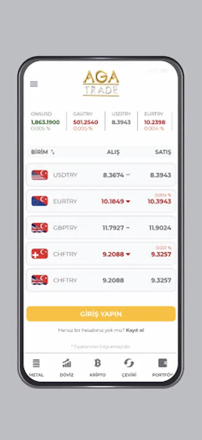 Anlık fiyatlar ve pariteler ile altın, döviz ve ziynet ürünlerini görebilirsiniz. Portföy imkanı sunan, çeviri ekranıyla kendi paritelerinizi oluşturabileceğiniz ve fiyatları anlık grafiklerle takip edebileceğiniz bir mobil uygulamadır.
