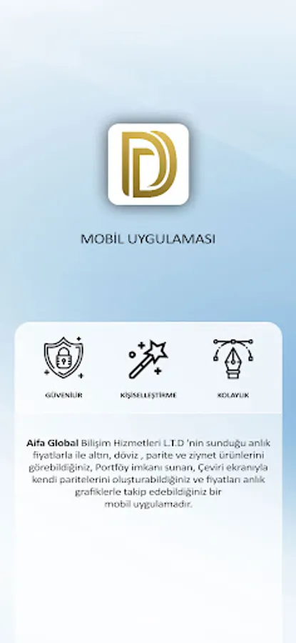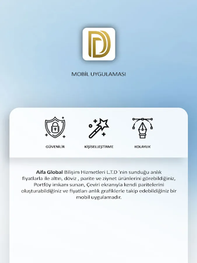 It is a mobile application where you can see gold, foreign currency, parity and jewelery products with instant prices offered by Aifa Global Bilişim Hizmetleri L.T.D.