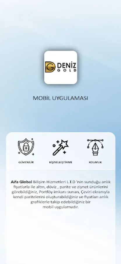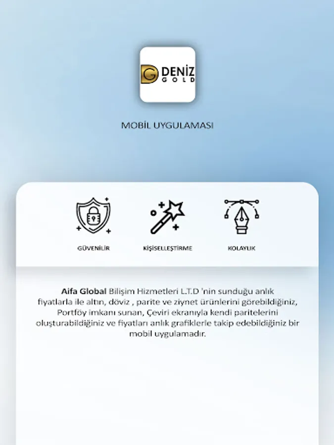 It is a mobile application where you can see gold, foreign currency, parity and jewelery products with instant prices offered by Aifa Global Bilişim Hizmetleri L.T.D.
