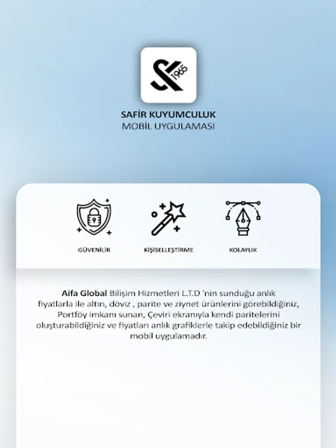 It is a mobile application where you can see gold, foreign currency, parity and jewelery products with instant prices offered by Aifa Global Bilişim Hizmetleri L.T.D.