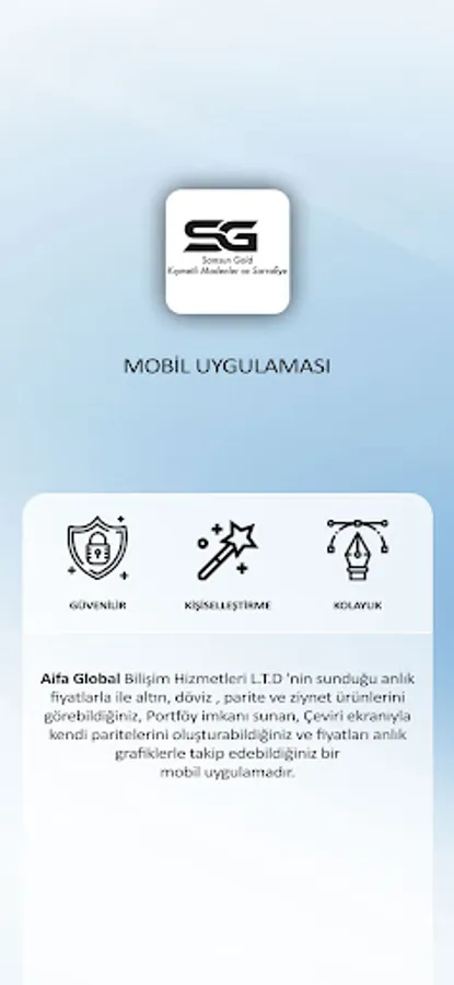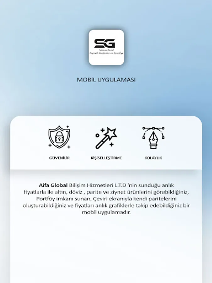 It is a mobile application where you can see gold, foreign currency, parity and jewelery products with instant prices offered by Aifa Global Bilişim Hizmetleri L.T.D.
