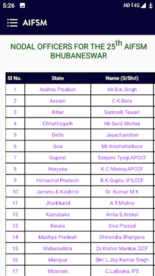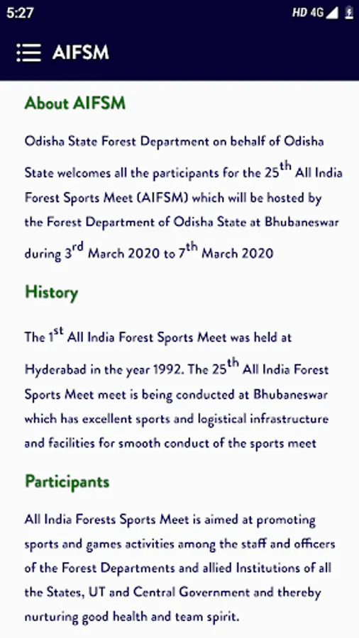 Mobile App is developed for the All India Sports meet for the forest department. The App gives the Information about Nodal Officers, State Coordinators, Games In charge etc. Status of registration of participants for the events, Transport and Accommodation. Event Venue details and Medal Tally will also be displayed.