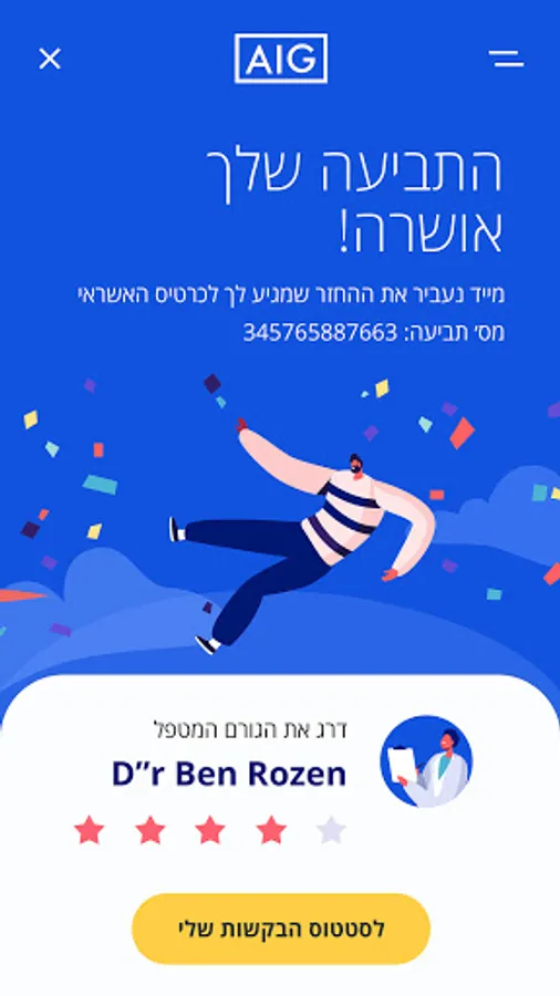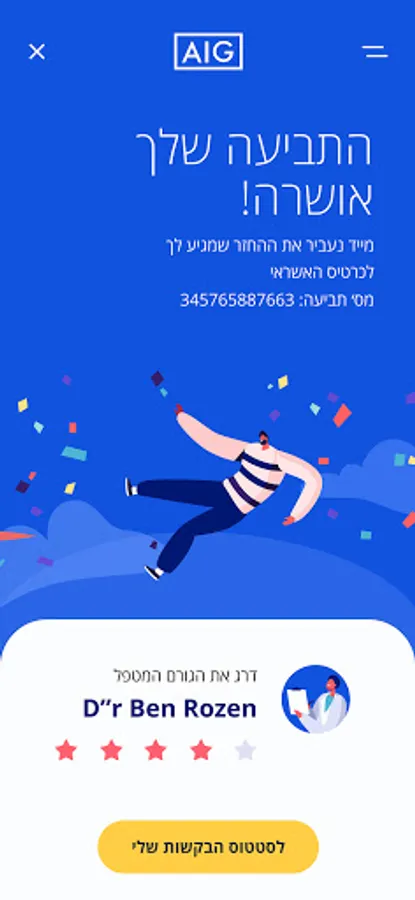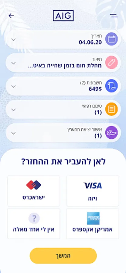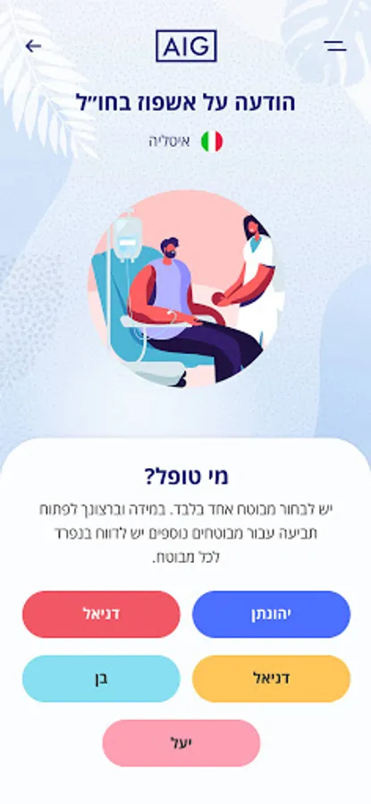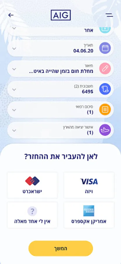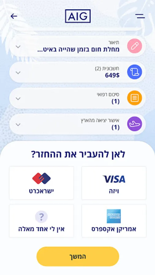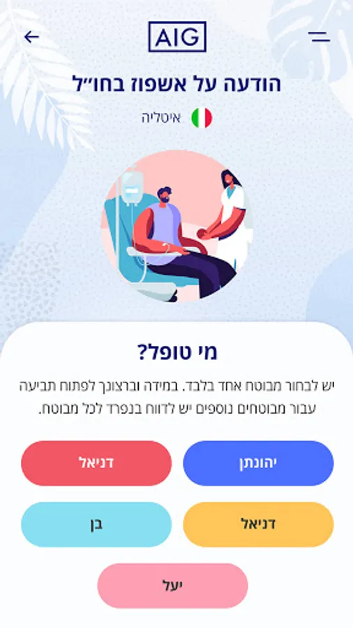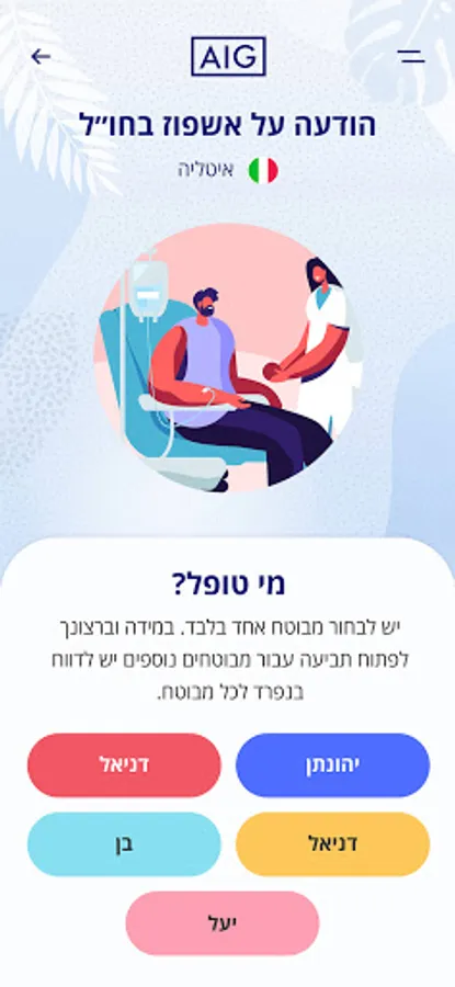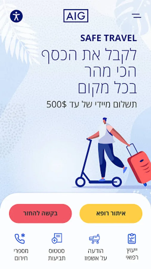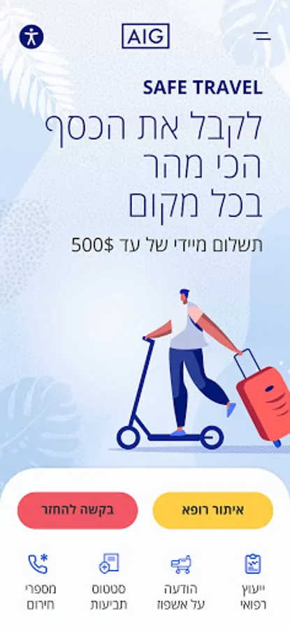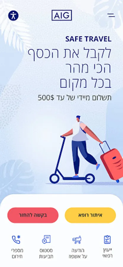 After you have purchased AIG's foreign travel insurance, simply download the AIG Safe Travel app. The free app will allow you to consult in Hebrew with a doctor online 24/7, locate nearby medical services and pharmacies and, no less important, receive reimbursement for medical expenses directly to your credit card !
