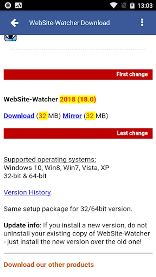 WebSite-Watcher checks your favorite websites and RSS feeds for updates and changes. When changes are detected, WebSite-Watcher saves the last two versions to your device and highlights all changes in the text. Unwanted page content can be filtered with ignore filters to avoid false positives.