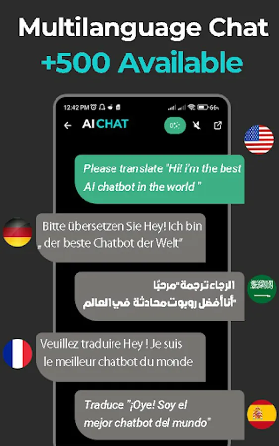 “AI ChatPro - Open bot Assistant ”s multilingual capabilities, powered by ChatGPT 4, mean that you can chat in any language you want. Translate text, learn and practice your language. Ask AI to act as a teacher!*