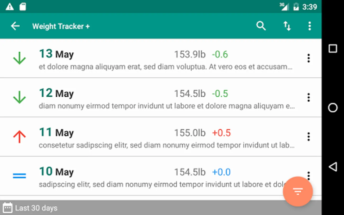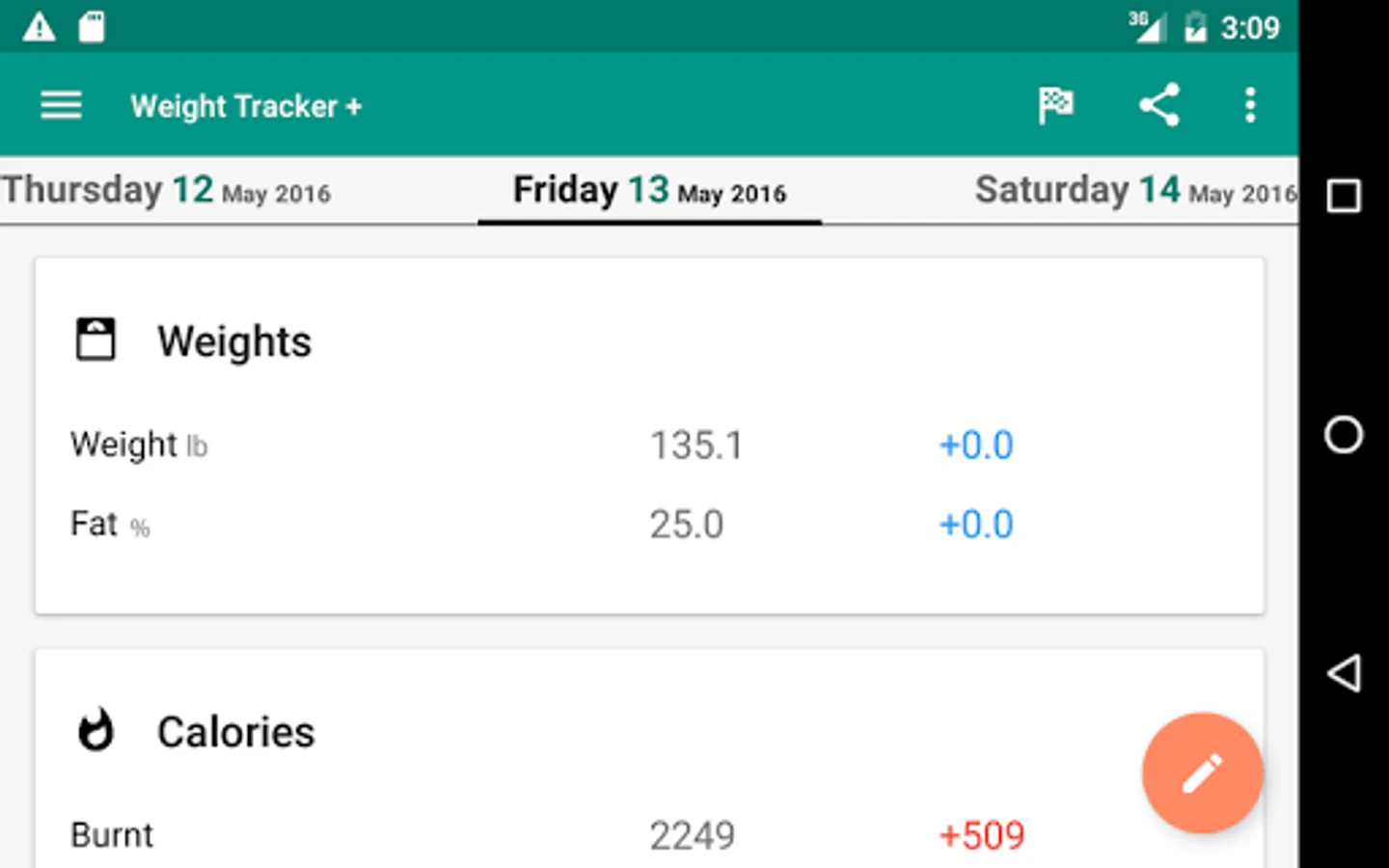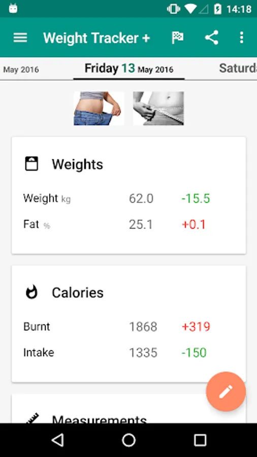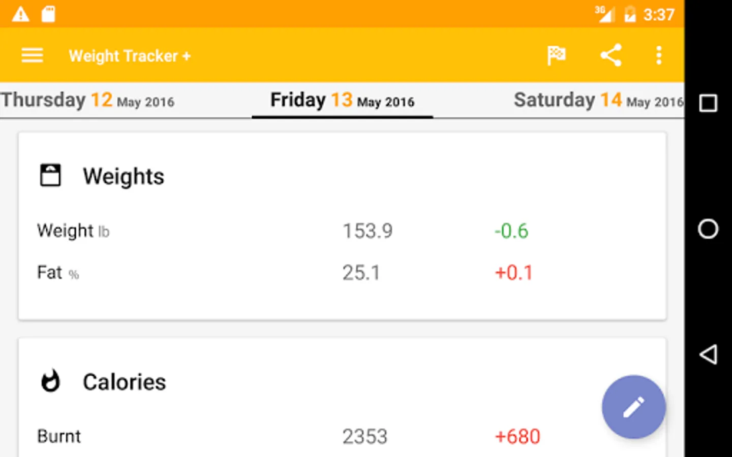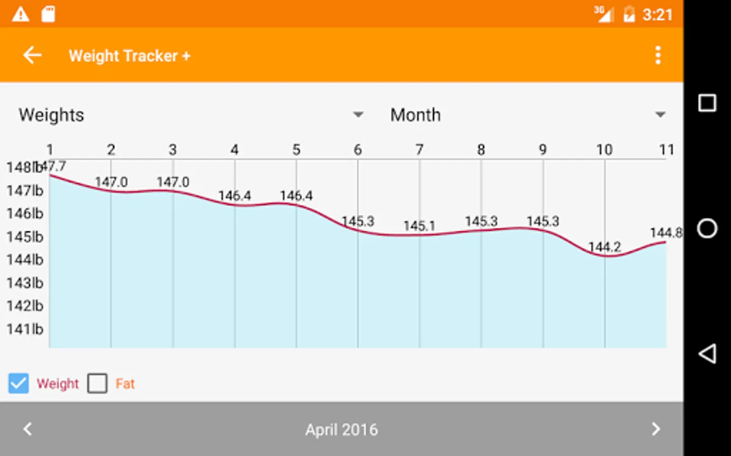 - Calendar (monthly view with the ongoing weight and the gain or loss variation for every day)