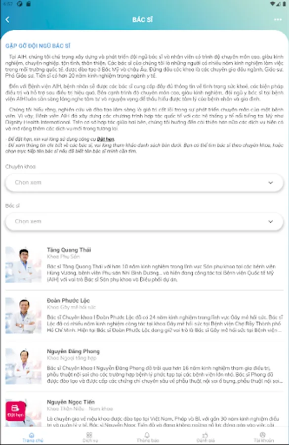 AIH application is a health management support application developed by AIH Hospital. Built with many preeminent features, AIH App allows users to be proactive in taking care of their personal and loved ones' health. The application is a companion with customers in each family's healthcare journey.