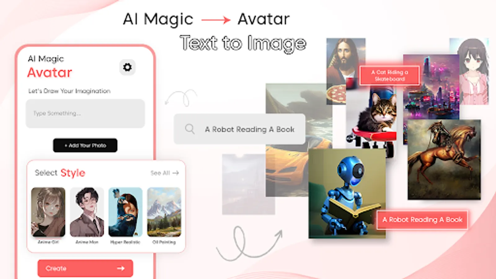 AI Magic Avatar - Text to Image is simple and easy to use by any user to create 3D, Anime, Sketch, and Text to image within some seconds. Text to the image is specially designed to convert your text into an image, select one of your chosen styles from the collection such as splatter, festive, cartoonist, Spectral, Flora, Diorama, Mystical and Dark Fantasy to adorn your ideas selected from different styles and turn your text into adorable avatar image.