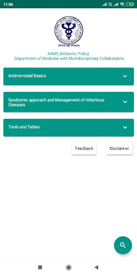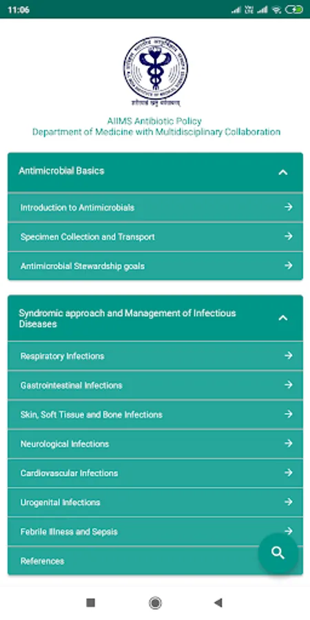 This application has been developed by the Department of Medicine, AIIMS New Delhi, with inputs from various surgical and medical disciplines at the institute. The antibiotic policy has been developed based on the hospital antibiogram and available recent literature. Also, this policy has been developed keeping the adult population in mind and should not be extrapolated to the paediatric age group. User discretion is advised when following this policy document, as antibiotic choice should be guided by the local antibiogram.
