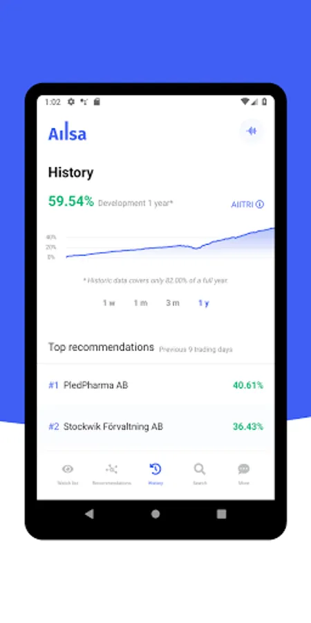 Under the history tab, you can check an overview showing which shares have generated the best opportunity for returns over the last nine days on the basis of Aiisa’s advice. You can also view how the AIITRI (Aiisa’s total returns index) has performed over the course of one week, one month, three months or one year.