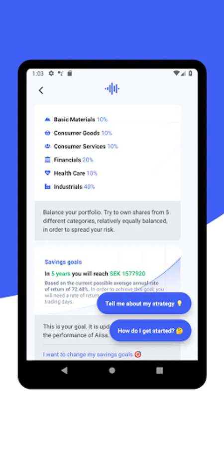For additional advice and tips, you can activate the savings coach in the app. The savings coach is your independent savings partner and will help you to meet your savings goals more quickly and at the lowest possible risk. You will get daily tips as to how many shares you should have in your portfolio, advice on whether you ought to move into a sector or industry and recommendations on how much money to spend each time. All tailored to your own savings goals and to the prevailing market conditions at the time.