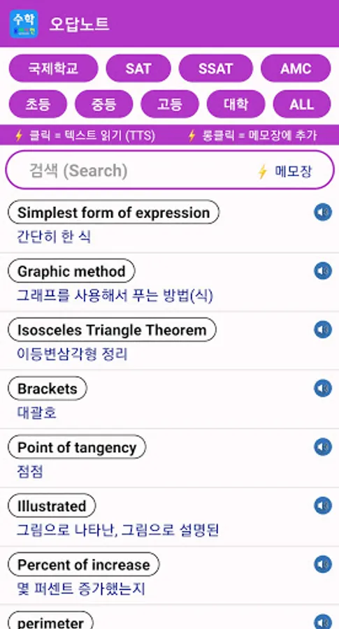 ■ Math terms (English expressions) can be saved and used in a notepad with a simple long click, and can be deleted from the notepad.