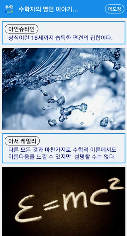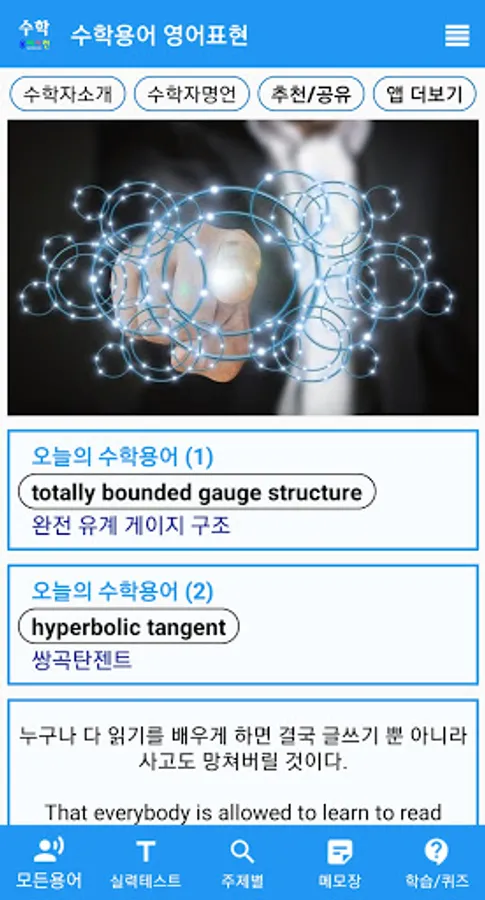 ■ You can easily explore and learn today's math terms, mathematicians introductions, and mathematicians' quotes.