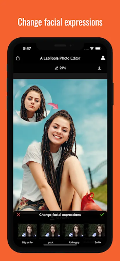 Change facial expressions - Use advanced image processing technology to edit the expressions of human faces in images. Supports application scenarios such as real-time effects and photo editing.