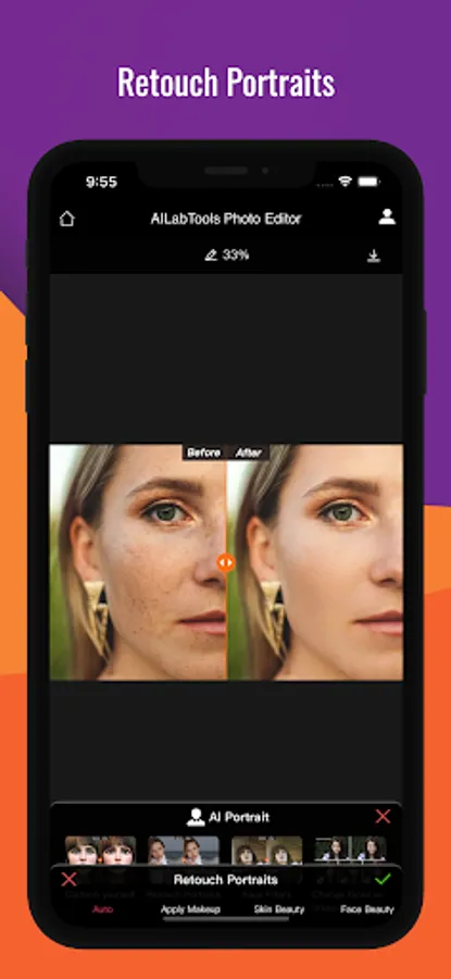 Retouch Portraits - Automatically evens out face areas, removes blemishes (acne, pimple marks, freckles, etc.) and whitens skin areas all over the body while retaining as much skin texture as possible through AI algorithms. Multi-player image processing is supported.
