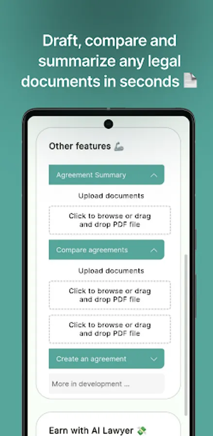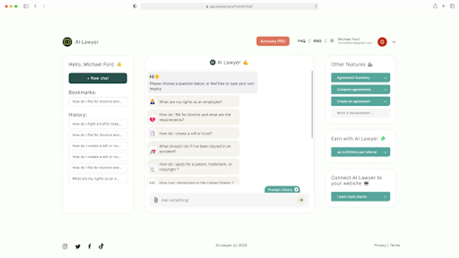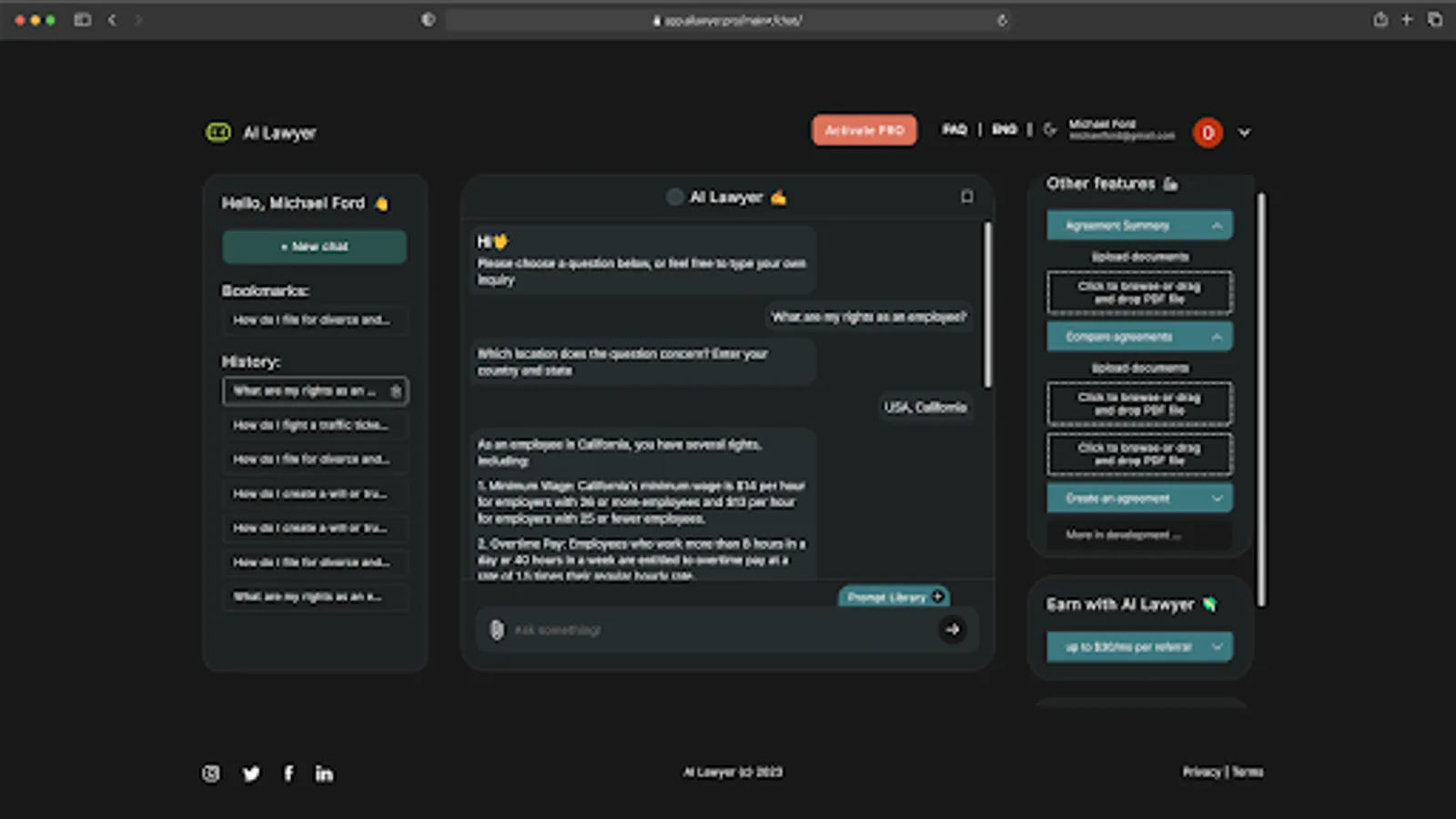 Say goodbye to expensive consultations, long waits for appointments, and confusing legal texts. AI-lawyer ready to give you expert legal help anytime, anywhere. Ask any question you want and we'll be happy to assist you. Create any legal agreement in one minute without legal expertise. Get an easy-to-understand summary of any agreement. Compare different agreements and see the differences between them.