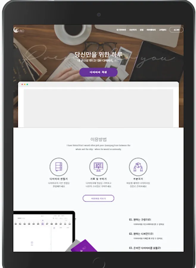 Why can't people always use the diary to the end? Why can't you find the diary you really want, and just dig around the existing diaries? This question led me to ponder the cause. And it came to the conclusion that the diary had the inefficiency of analog and lacked the opportunity to create a diary of its own. However, as can be seen in many stationery stores every year, even today, the digital age has come, consumers still prefer analog diaries. That's why we want to create a service that creates an diary that can truly satisfy the needs of consumers by implementing the analog diary as an application and overcoming the inconvenience of the analog diary through customization and customization.