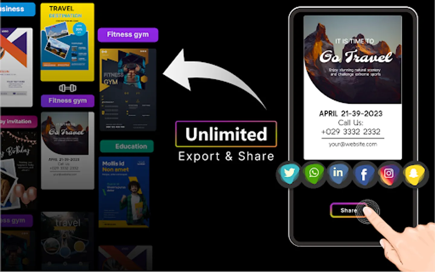 Our Poster Maker App offers effortless interaction with social media platforms as it provides the services of logo Maker, Flyer Maker, Poster Maker, and Banner Maker for your Graphic Design portfolio. Whether you are Designing Posters for a business, school project, or personal use, Poster Maker is here to cover all your needs.