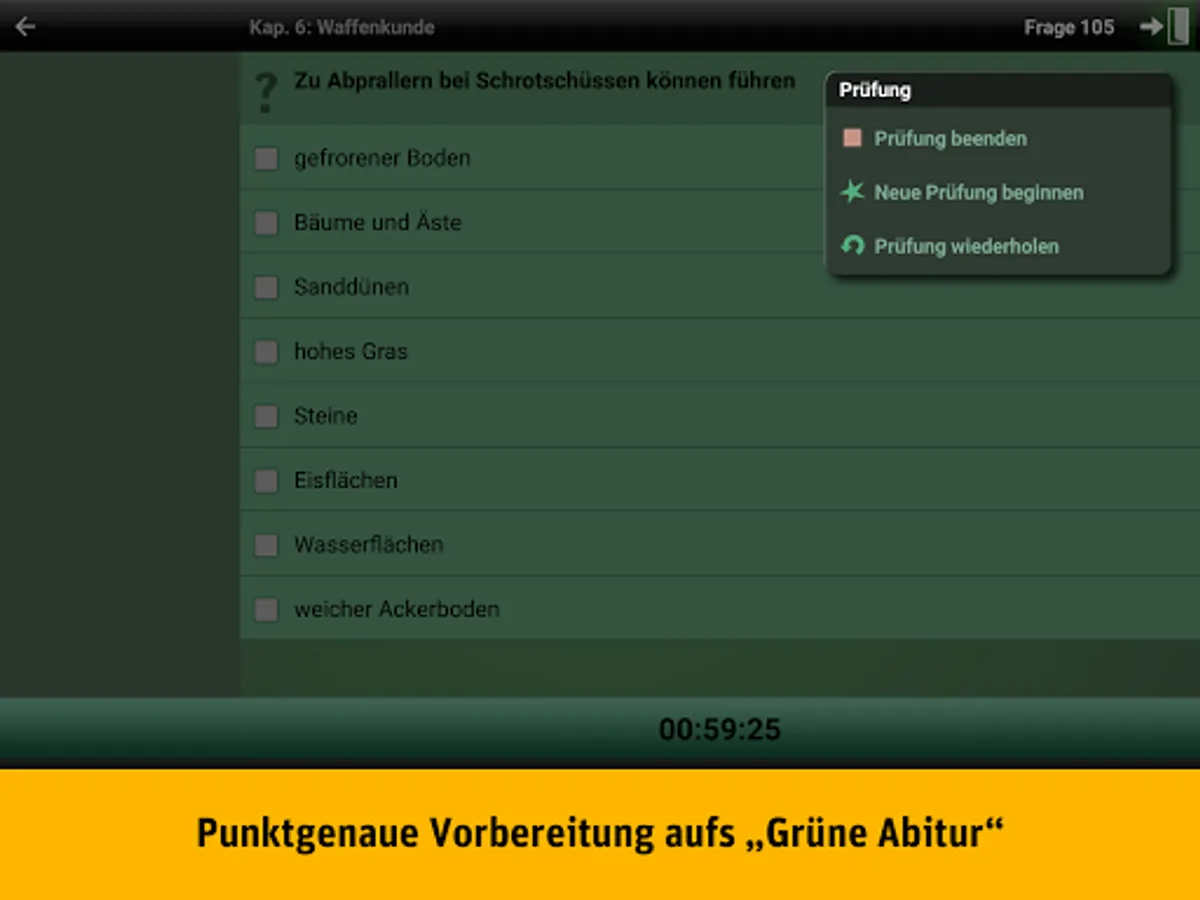 - Test mode: Country-specific test simulation for the hunting license with valid timelines and subsequent evaluation