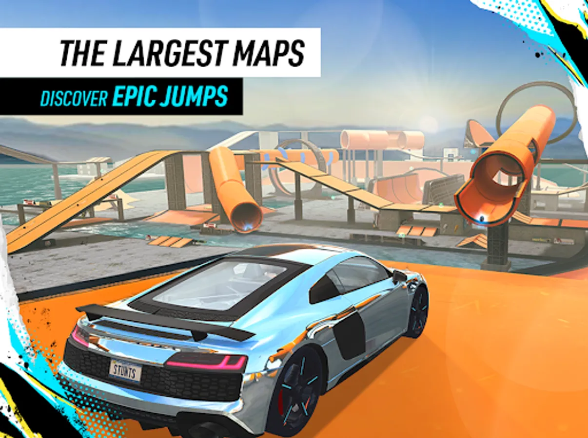 Drive your sports car in the stunts and obstacles of the open free mode! Will you climb the mega ramp?