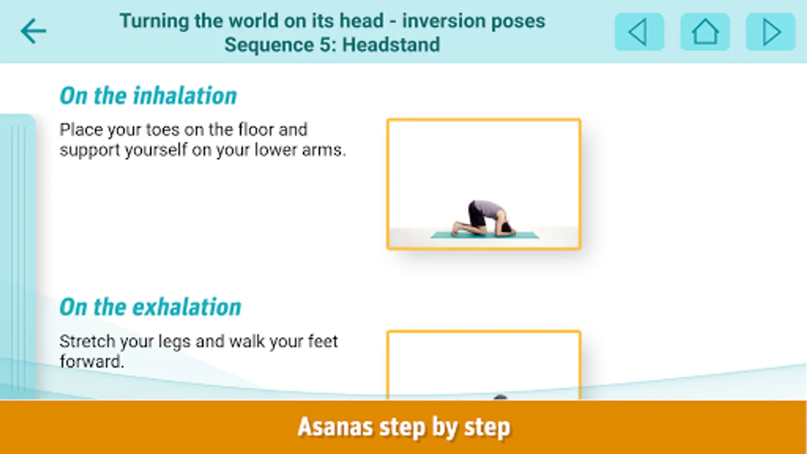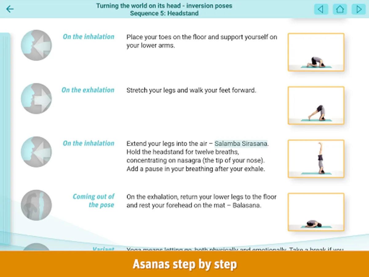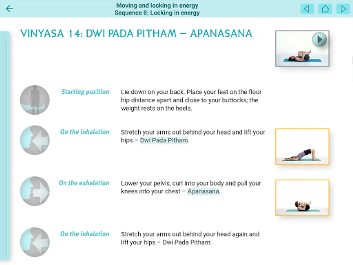 - Videos, pictures and texts explain breathing, posture and dynamic movements of Yoga