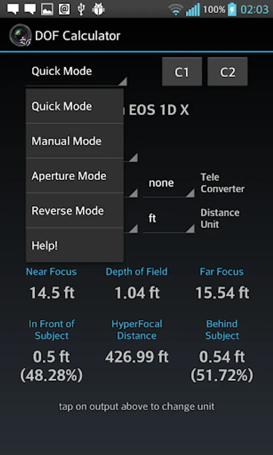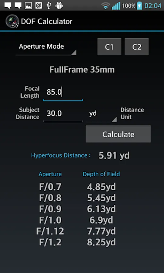 Aperture Mode lets user select Camera, Focal length, and Subject Distance, and calculates resultant depth of field against all aperture values.