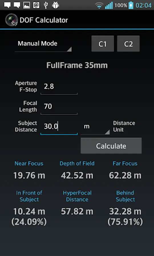 DOF Calculator Pro is the paid ads free and permissions free version of the most popular DOF Calculator on Android Play Store. Calculates Hyperfocal Distance, Near Focus Limit, Far Focus limit, and Depth of Field(DOF).