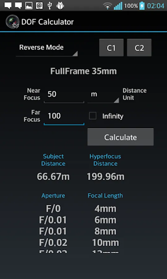 Reverse Mode, takes Near Focus and Far Focus distance values and calculates all the possible combination of focal lengths and apertures to achieve the entered values.