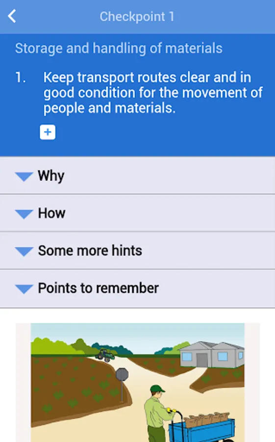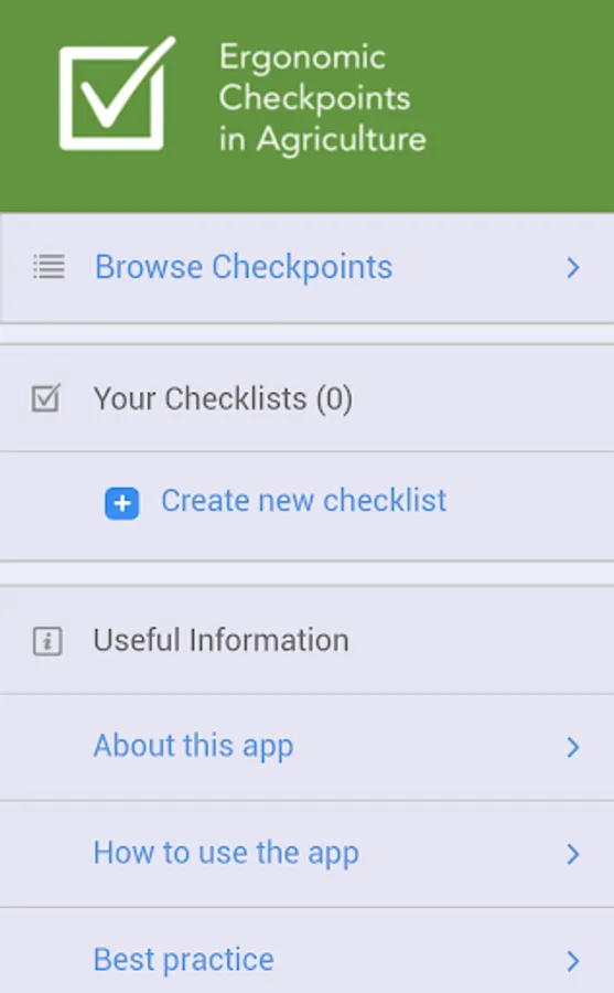 The Ergonomic Checkpoints in Agriculture app allows you to create interactive checklists of ergonomic checkpoints to use in the agriculture sector. There are 100 checkpoints in total. The app also includes best practice recommendations for taking action and implementing effective safety and health improvements in an agriculture environment