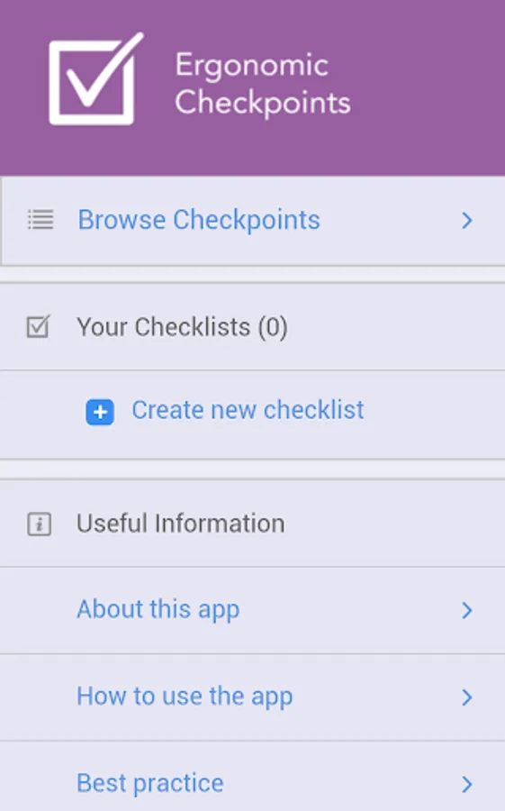 The Ergonomic Checkpoints app allows you to create interactive checklists of ergonomic checkpoints to use in the workplace. There are 132 checkpoints in total. The app also includes best practice recommendations for taking action and implementing effective improvements in ergonomics in the workplace.