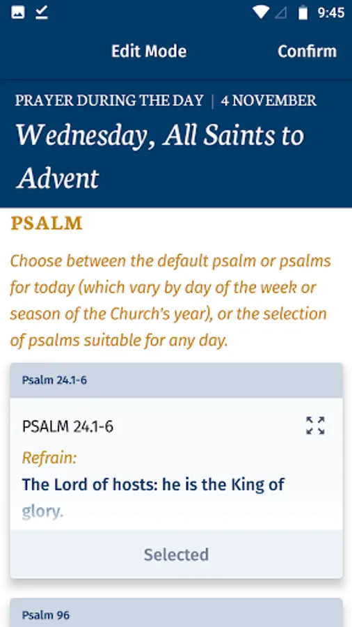 • Edit Mode. You can also use the 'pencil' icon to enter 'Edit Mode' and make choices about the psalms, prayers and readings in each service. The defaults mirror the content of the audio, but you are free to make other selections for psalms, readings and prayers based on the provisions of Common Worship: Daily Prayer.