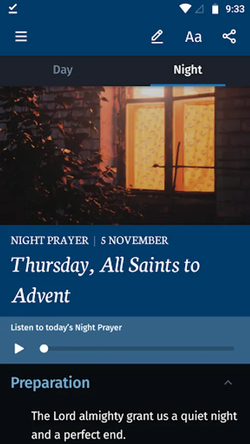 • Adjustable settings and timings. Use Settings to adjust the time of day the app shifts from Day to Night. And you can set reminders for one or more of the services to help you establish and maintain a rhythm of prayer throughout your day.