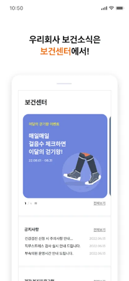 “Health Benefits” supports the “Health Center” function that delivers information on various health-related programs and events operated by the health team of affiliated affiliates. Events/notices/welfare programs/comprehensive checkup reservations/cabinet menus, etc.