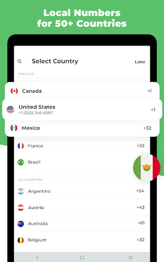Support for many international phone numbers including United States US, United Kingdom UK, France FR, Brazil BR, Canada CA, Spain ES, Mexico MX, Australia AU, South Korea KR, Japan JP and over 40+ countries!
