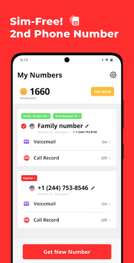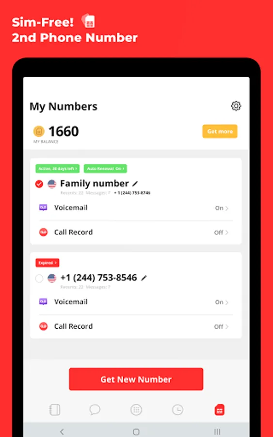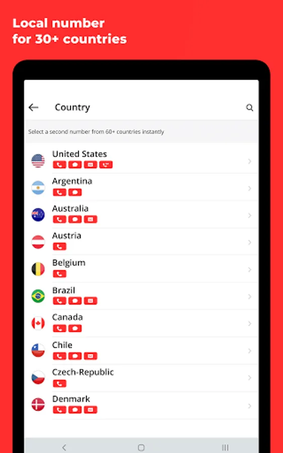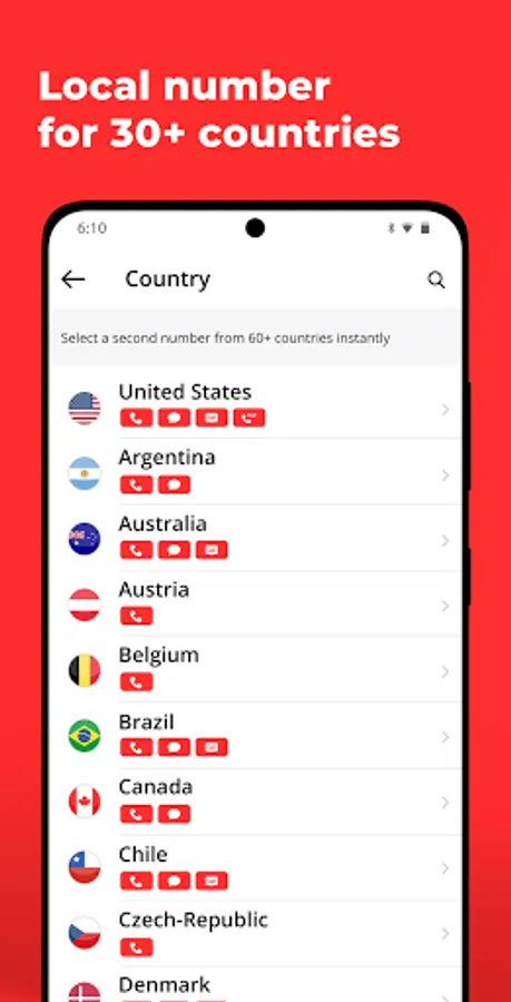 VARIOUS NUMBERS: App displays a list of 30 countries' numbers. Here are some of the most popular countries: USA, UK, Canada, Germany, France, Japan, etc. Virtual numbers are operated like real ones, no need for second SIM!